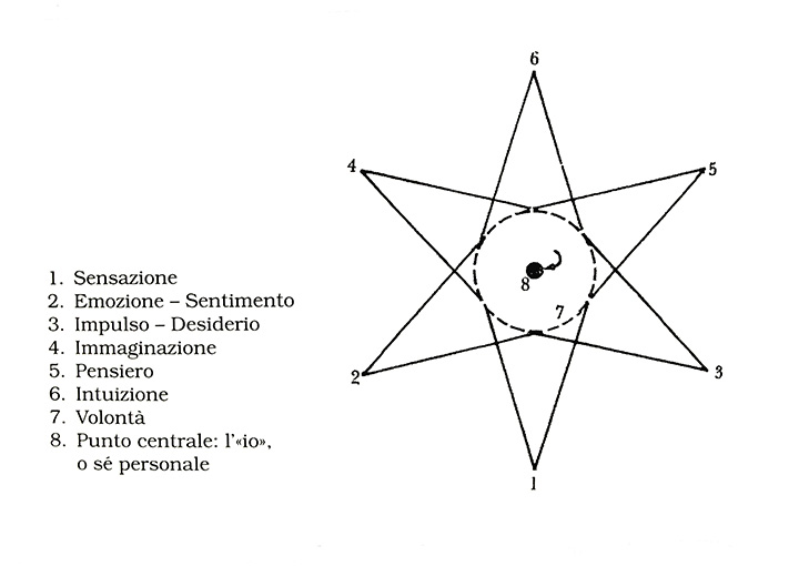 Assagioli sintetizza la sua teoria della personalità utilizzando 2 immagini: un ovoide per illustrare l’anatomia della psiche e la stella delle funzioni per descriverne la fisiologia.