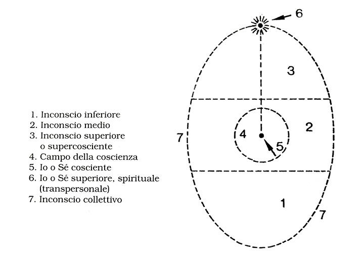 Nell’ovoide viene rappresentata la totalità della nostra psiche, le aree che delimitano gli spazi sono tratteggiate per indicare che non c’è rigida separazione tra i livelli ma continui scambi ed interazioni; la prima suddivisione è tra inconscio personale (1-2-3) e inconscio collettivo (7), termine coniato da Jung che sta ad indicare che la nostra psiche non è separata ma immersa in un contenitore psichico universale condiviso da tutti gli uomini e che deriva dai loro comuni antenati.
